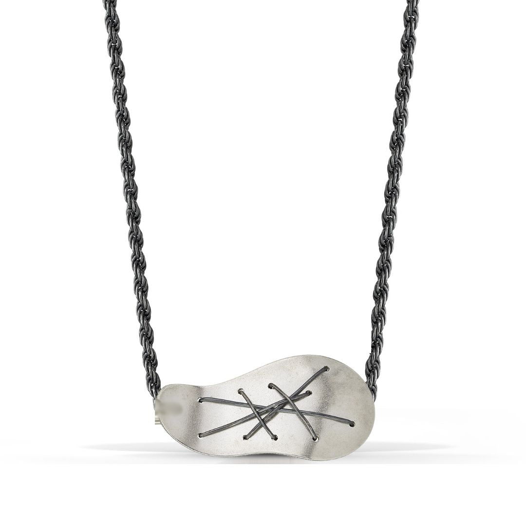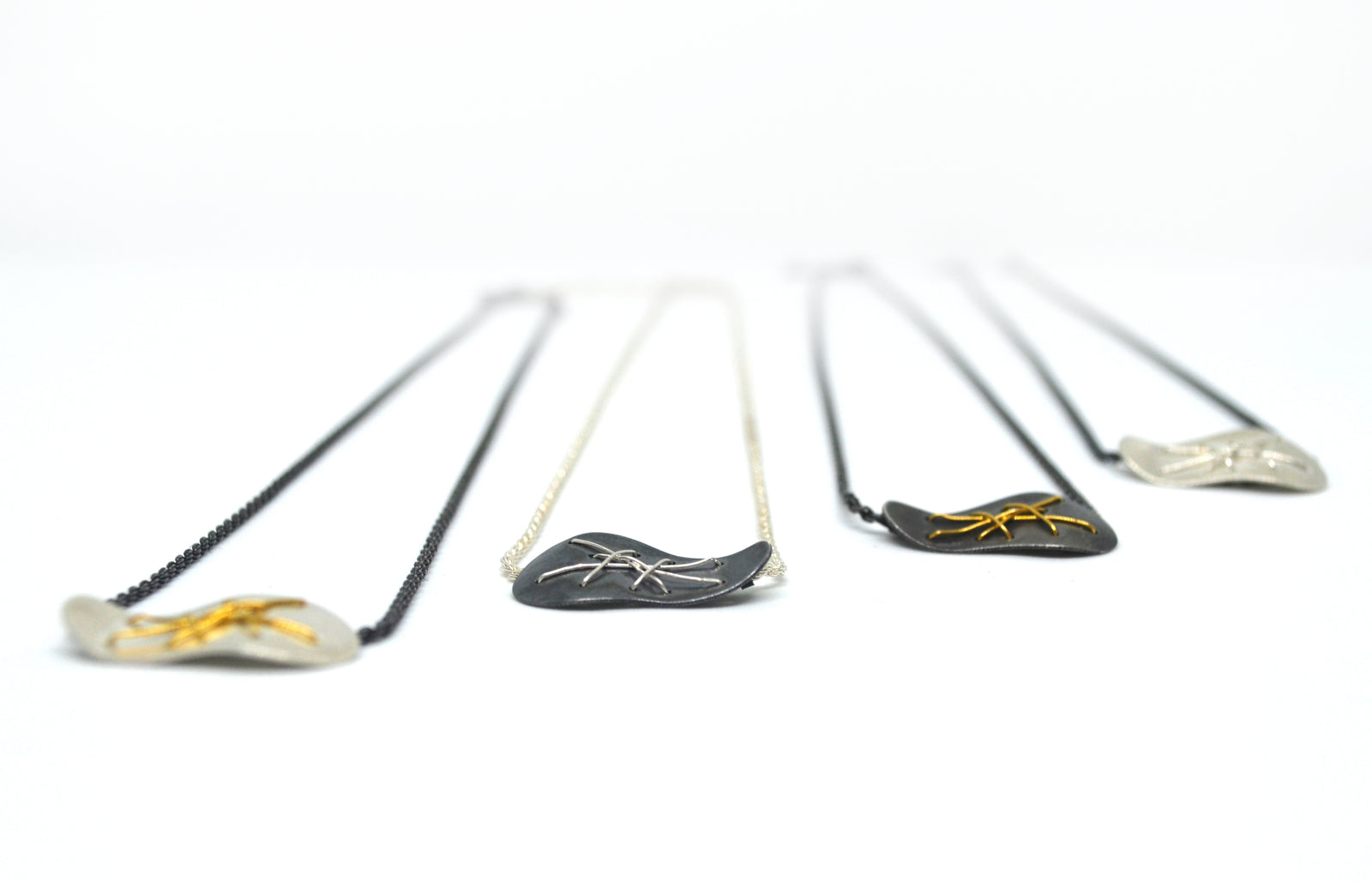 From delicate pendants to bold statement pieces, each necklace transforms Argentium silver through Suzanne's signature stitched metal technique. Fine 22k gold wire weaves intricate patterns that echo textile traditions while creating thoroughly modern silhouettes. These artisan jewelry pieces become personal talismans.