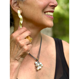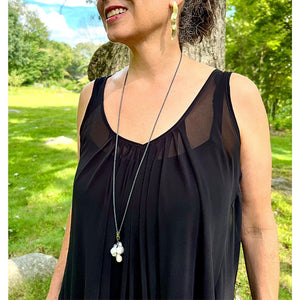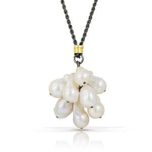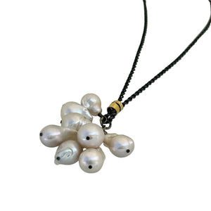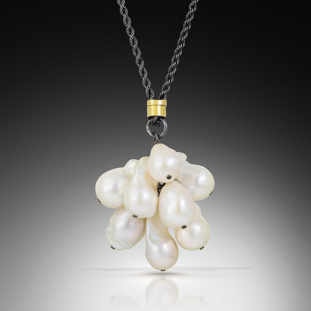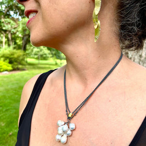 This beauty blendsseven gorgeous freshwater baroque pearls with 22k gold accents on an oxidized silver rope chain. It needs nothing more than you to show it off! This necklace can be doubled to create a shorter length.